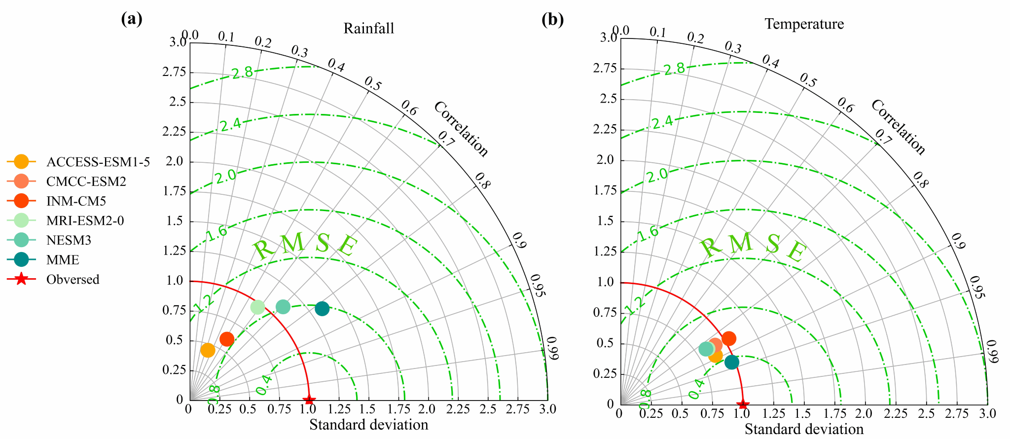 Fig. 3 Taylor diagram of CMIP6 model data for simulation of rainfall and temperature in Guizhou.