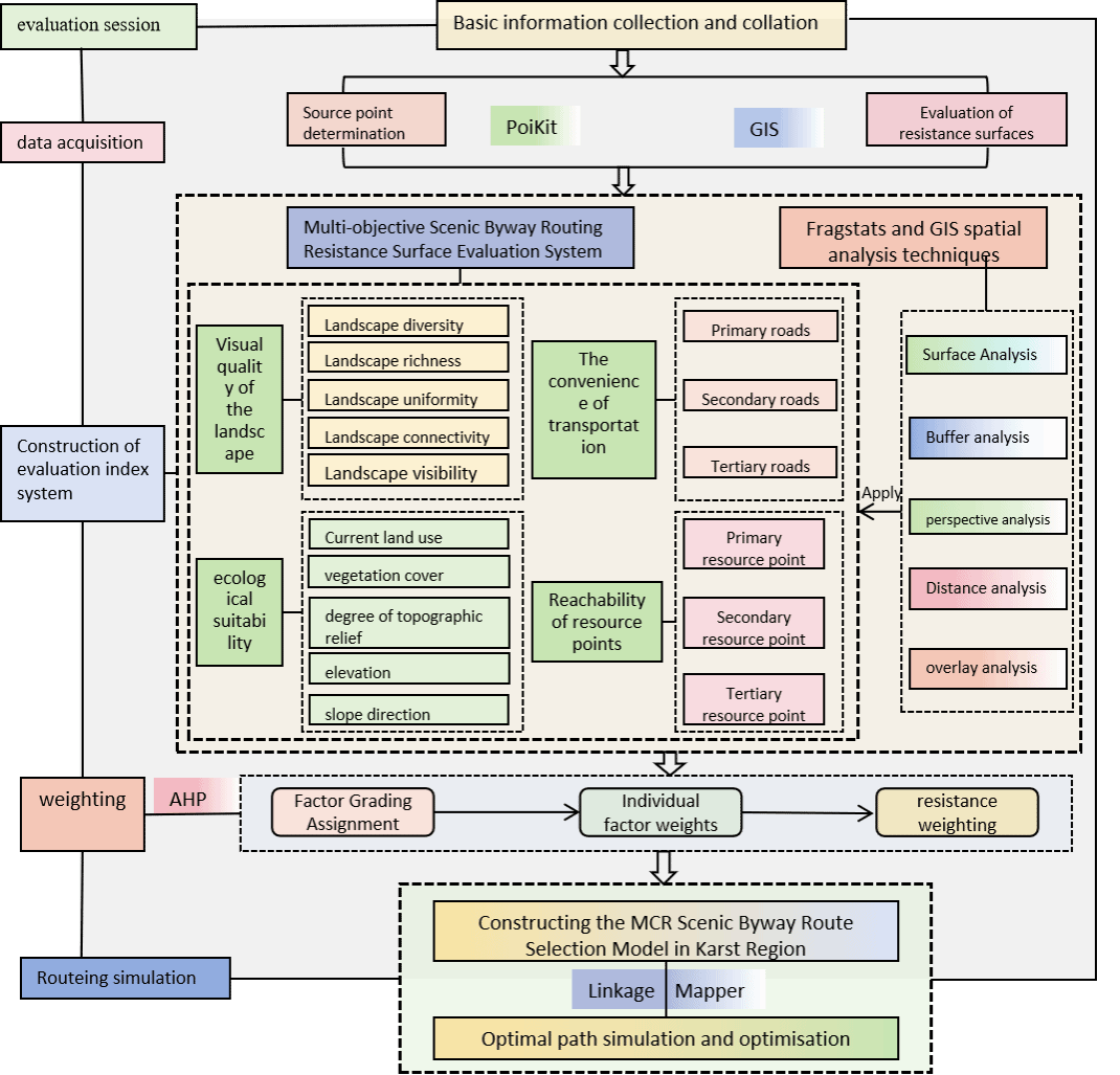 成果简介:风景道是喀斯特地区旅游业、交通运输业融合发展的新形态,研究风景道选线对促进喀斯特地区景观资源合理利用与可持续发展具有重要意义。以滇桂黔喀斯特石漠化区南北盘江流域为例,选取景观视觉质量、生态适宜性、交通便捷性与资源点可达性4个维度16项因子构建风景道选线评价指标体系,基于最小累计阻力构建综合阻力表面模型,并结合源地进行最优路径模拟及选线规划。研究表明:(1)受地形地貌、交通网络及资源点的影响,南北盘江阻力空间分布格局整体上呈“中间低四周高”特征,低阻力区主要围绕一级景点与交通网络分布在流域中部,而高阻力区分布在流域东南及西北方向。(2)以273个景点作为生态源地,共生成494条生态旅游廊道,生态廊道重要程度总体上呈现出“中部高四周低”的分布态势。(3)构建的南北盘江流域喀斯特风景道整体呈现环形网络状,分为喀斯特山水民族风情风景道和喀斯特避暑三线文化风景道。以期为我国喀斯特山区风景道的规划建设提供借鉴。