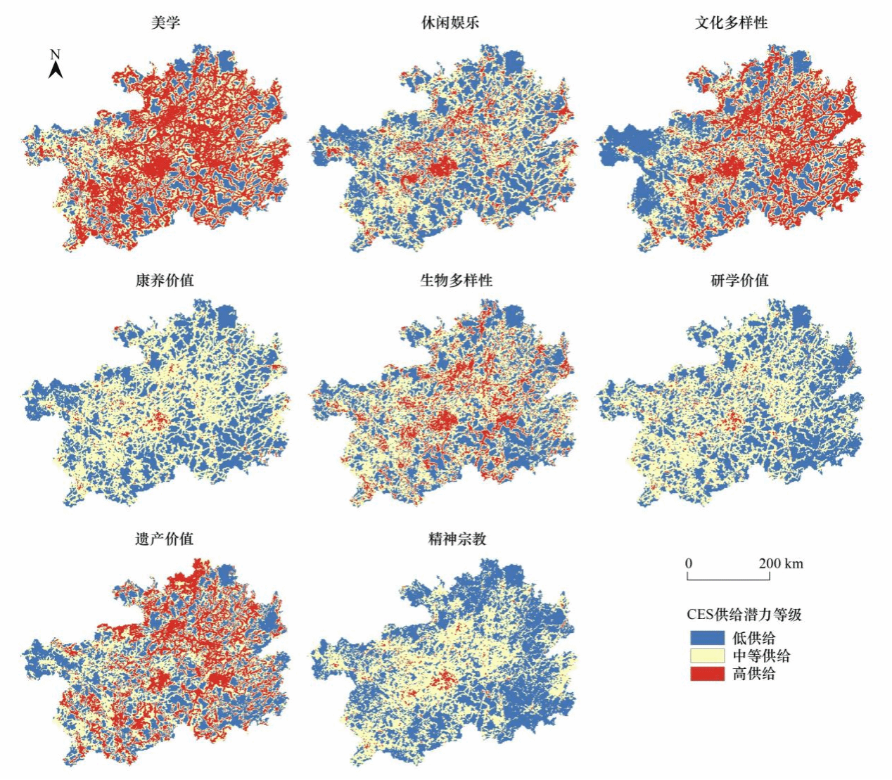 成果简介:山地旅游区是提供生态系统文化服务(CES)的重要场所,评估其CES供需匹配关系对区域生态景观与游憩空间的规划管理和提升人类福祉至关重要。以贵州省为典型山地旅游区案例地,结合社交媒体文本与MaxEnt模型的综合评估方法量化CES的实现需求与潜在供给,运用ArcGIS对CES供需及匹配关系的空间格局进行制图与评估,并基于地理探测器探究CES供需匹配的影响因素。研究表明:(1)美学、休闲娱乐、文化多样性、康养价值、生物多样性、研学价值、遗产价值和精神宗教是贵州省CES的主要表征类型。(2)CES需求以省内知名旅游景区和中心城区为核心集聚区,并向四周逐渐递减,高需求和中等需求在空间上呈现“分散式、多核心”分布格局,而CES高供给和中等供给则集中在各城市区域、旅游景区和交通线网附近,呈现多核心团簇状分布和沿交通干线呈条带状集聚分布的“多核心、多条带”分布格局。(3)根据CES供需匹配关系可将贵州省划分为文化服务需求区、平衡区和潜力区三类,三类分区的空间分布均具有较强的异质性,文化服务潜力区面积远大于其他分区。(4)CES供需匹配影响因子间交互作用的空间解释力相较于单因子强,其中高程和土地利用的影响最为显著,CES的自然因素解释力整体强于社会因素。本研究为厘清贵州省CES供需及匹配的空间分布格局与影响因素,通过对CES供需热点区域进行潜力点识别和价值转化,以实现山地旅游区自然资源的合理配置和生态游憩空间的保护开发与结构优化提供理论借鉴与实践参考。