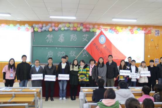 启动仪式分为四个阶段进行。第一阶段,杨建红代表学院致欢迎词,向与会人员的到来表示热烈的欢迎,向一直支持学院学生工作的部门和社会人士表示衷心的感谢;指出了毒品、艾滋病的巨大危害性,并针对“禁毒防艾”宣传教育工作提出三点要求:一是要引起高度重视,增强禁毒防艾知识;二是要加强宣传教育,普及禁毒防艾知识;三是要规范日常行为,增强自我保护意识;最后,号召大家积极参与到“禁毒防艾”宣传工作中,主动远离毒品、艾滋病。第二阶段,活动负责老师王磊从项目背景、项目内容和逾期目标三个方面对“贵州省贵安新区大学城禁毒防艾黔行之路”项目做了详细介绍,希望通过该项目的实施,能够让大学城更多的师生认识到毒品和艾滋病的危害性,珍爱自己的健康和生命。第三阶段,饶蕾为“禁毒防艾”志愿者服务队授旗,并在讲话中指出,当前禁毒防艾形势非常严峻,禁毒防艾工作迫在眉睫,青年学生是社会的中流砥柱,更是禁毒防艾的主要倡导者、宣传者和实践者,希望在场的同学们树立正确的人生观、价值观,增强自我保护能力,携起手来,共同唱响“珍爱生命,远离毒品,拒绝艾滋”的主旋律。第四阶段,姚敏作了“2016年青年学生艾滋病防治知识”专题讲座,结合世界艾滋病日这一主题,从艾滋病的致病原理、发病症状、传播途径、防制措施等方面逐一进行讲解;重点结合自身工作经验,介绍了艾滋病对社会安定及经济发展造成的巨大危害,强调了全面开展大学校园艾滋病防范宣传工作的重要性,进一步剖析了艾滋病控制的严峻形势,解读了艾滋病常见误区,警示广大学子洁身自好。
