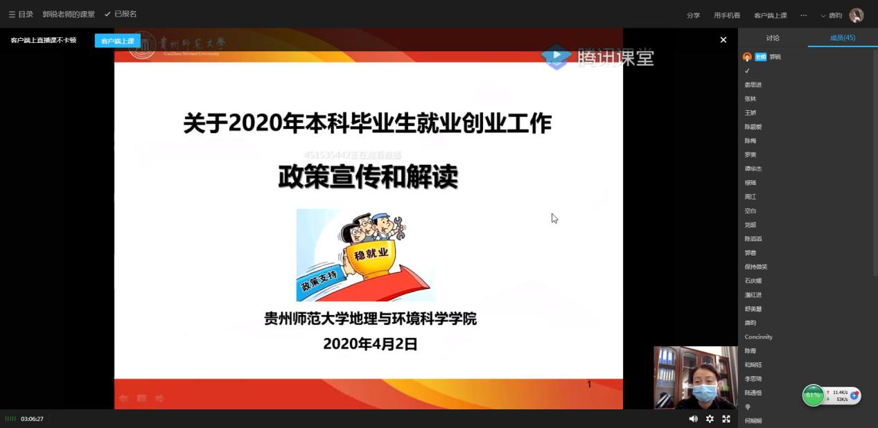 本次就业指导课分专业分班级进行。首先,郭锐亲切问候毕业班的同学,并就当前疫情期间学校的工作安排给大家做简要说明,强调了毕业班当前的两大任务是毕业论文和就业。其次,郭锐就今年就业面临压力和带来的机遇给同学们做详细解释。郭锐先是深入分析了今年的就业形势的严峻性,提醒同学们要提高就业紧迫感,积极投身求职应聘;接着就基层项目就业政策做了详细解读,鼓励同学们积极投身基层,让青春在脱贫攻坚主战场和基层一线上闪闪发光。最后,郭锐再次强调学校暂未确定返校时间,望同学们积极配合学校的疫情防疫工作。