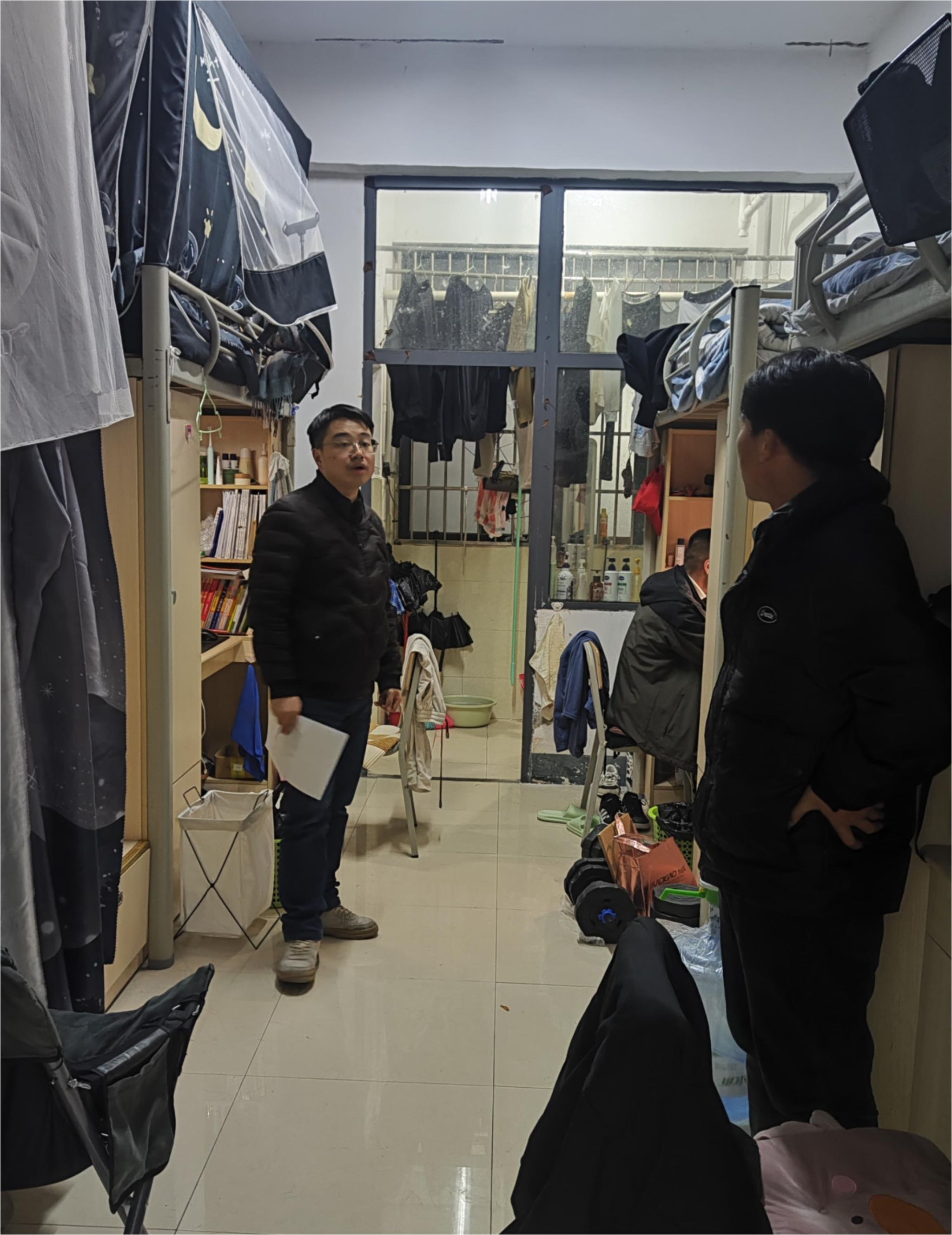 2023年12月12-21日晚,必赢242net官网开展期末常规走寝活动,活动由院党委副书记郭锐牵头,学院辅导员组成走寝团,分批次深入到慎思书院3栋、博学书院8栋、笃行书院18栋等必赢学生寝室看望同学们。