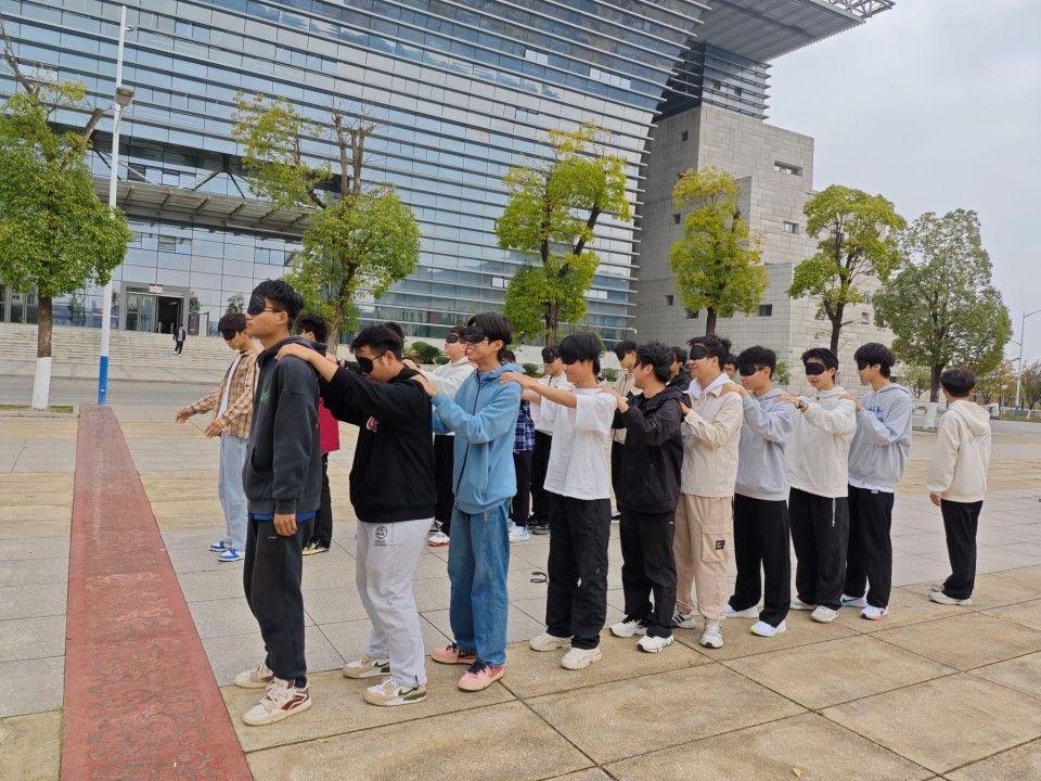 11月初,各班陆续开展了新生素质拓展活动。此次活动由几个小游戏组成,包括方向指令、蒙眼找球以及放飞梦想纸飞机。在方向指令游戏中,同学们需要高度集中注意力,听从指令做出反方向动作,这不仅考验了大家的反应能力,还增进了彼此之间的默契。蒙眼找球游戏则让同学们在黑暗中感受信任与合作的力量,被蒙住眼睛的同学在同伴的指引下努力寻找目标,现场气氛紧张而又充满欢乐。而放飞梦想纸飞机环节,同学们将自己的梦想写在纸飞机上,一起放飞,寓意着梦想的起航。这些小游戏让同学们在轻松愉快的氛围中拉近了彼此的距离,为后续的活动奠定了良好的基础。